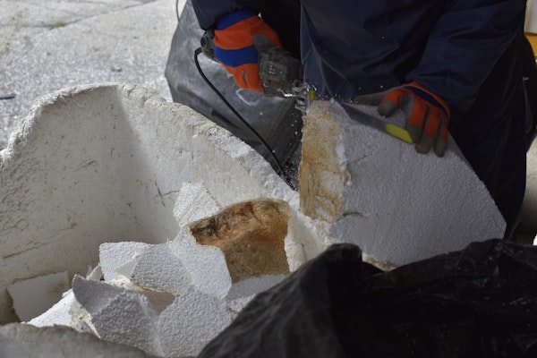 発砲スチロールも回収が多いゴミの一つですが、汚れがひどい箇所は一つひとつ手作業で切り落とすという大変な作業を行っておられます。