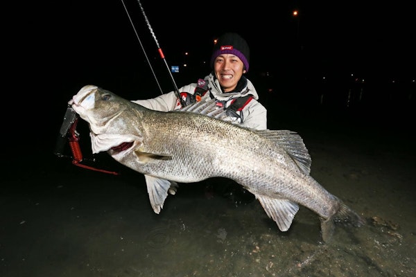雑誌取材中にラムタラで釣り上げた121cmという化け物シーバス(北添貴行)