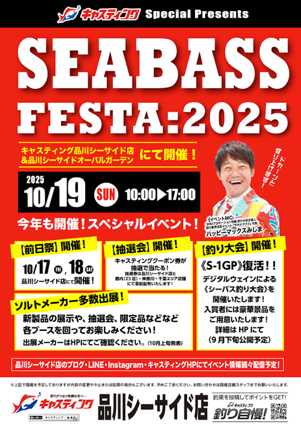 10月19日(日)、東京都キャスティング品川シーサイド店主催の『シーバスフェスタ2025』に今年もブース出展致します。