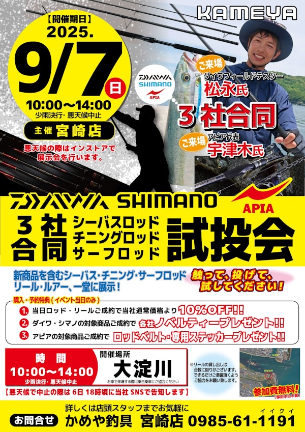 9月7日(日)かめや釣具 宮﨑店主催で開催される【3社合同試投会】に参加いたします。